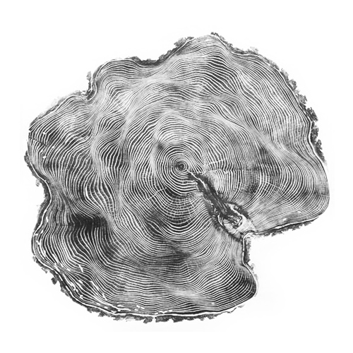 what is super interesting about this print, though, is the weird tree ring pattern going on here. each one of those rings grows uniformly around the tree every spring and summer, but Gill carves slight bumps and ridges into the face of the stump to get those tight clusters of rings. you can see how he made it here or (have lotsa dollars?) buy it here.